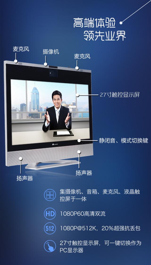 華為DP300是一款面向高端客戶的一體化桌面智真。它采用了高雅簡約的設計理念,將1080P全高清數(shù)字攝像機、高保真音箱、高品質麥克風、27英寸液晶觸控屏完美地融合成一個整體,是企業(yè)高端客戶進行個人視頻通訊、協(xié)同辦公的完美選擇。訂購電話:400-0512-402!