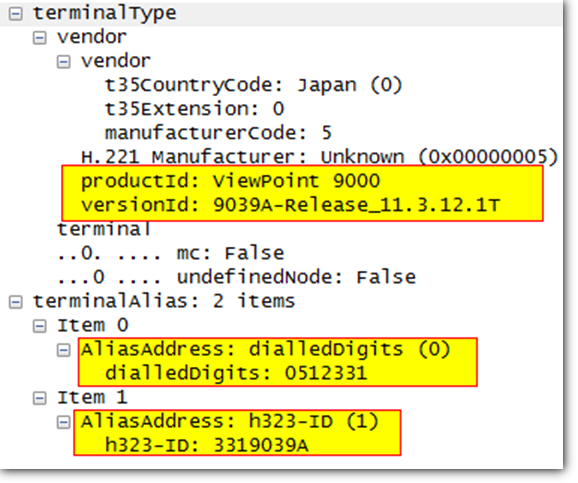 • dialledDigits和h323-ID字段,分別表示注冊(cè)的具體內(nèi)容