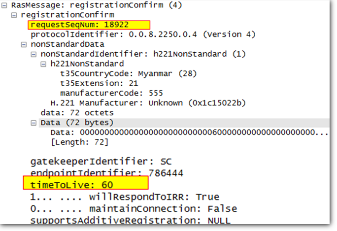 以下說(shuō)明GK返回的注冊(cè)確認(rèn)RCF消息中的各字段。requestSeqNum,表示消息的序列號(hào),這個(gè)值與RRQ請(qǐng)求中的內(nèi)容保持一直,用該系列號(hào)標(biāo)識(shí)本次交互過(guò)程。