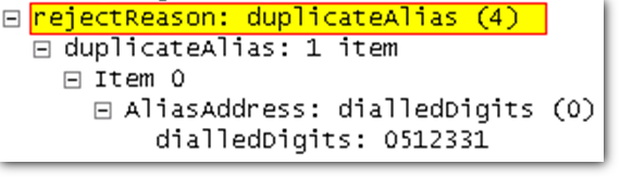 rejectReason表示拒絕原因,duplicateAlias,即別名沖突,因?yàn)橐呀?jīng)有號(hào)碼為0512331的終端注冊(cè)過(guò)。因此不可再次在終端注冊(cè)。