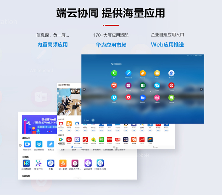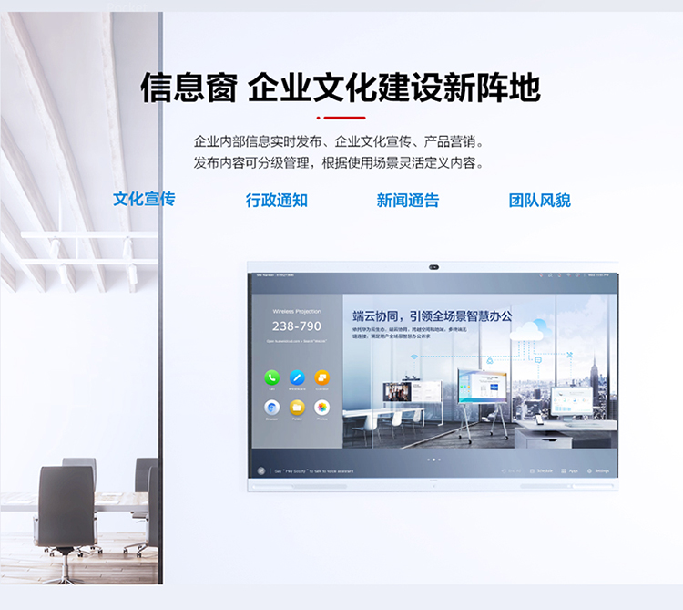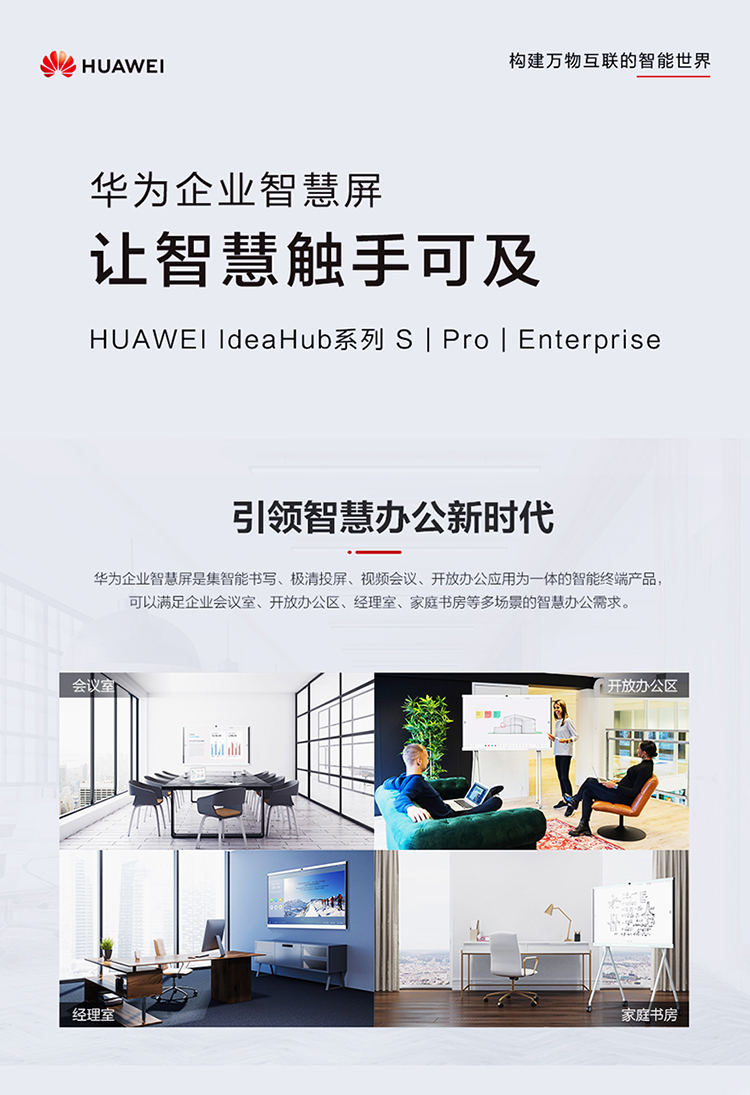 華為企業(yè)智慧屏HUAWEI IdeaHub是集智能書寫、極清投屏、視頻會議、開放辦公應(yīng)用市場為一體的智能終端產(chǎn)品,是面向企業(yè)團(tuán)隊協(xié)作的新終端品類,可以滿足企業(yè)會議室、經(jīng)理室、開放辦公區(qū)等多場景的智慧辦公需求。