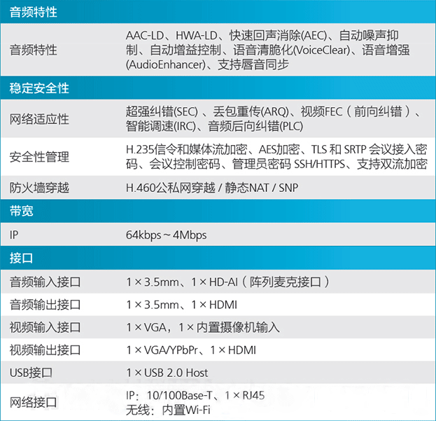 - 高度集成一體化智能硬件,高保真全向麥克風(fēng),8米拾音距離,1080p、90度大廣角光學(xué)攝像頭、無畸變,專業(yè)高清視頻硬件編解碼,簡單用戶體驗,支持有線、WIFI及4G網(wǎng)絡(luò)接入。