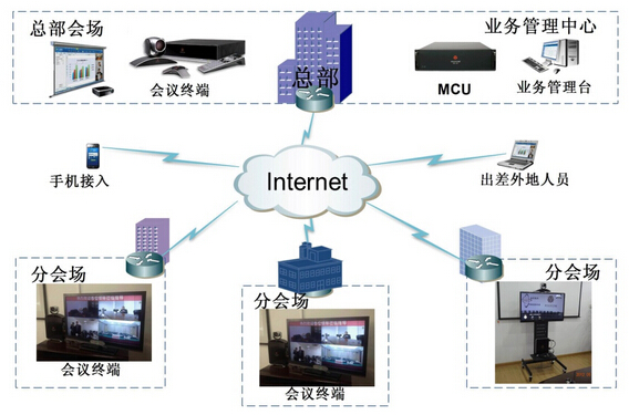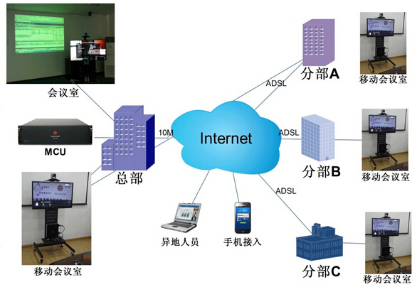 如上圖所示,在公司總部架設(shè)一臺MCU服務(wù)器,負(fù)責(zé)視頻會議數(shù)據(jù)的轉(zhuǎn)發(fā)??偛看罱ㄒ粋€中心會議室,使用視頻會議硬件終端以保證會議室的易用與穩(wěn)定,若還需要滿足會議地點的靈活性,可以再搭建一個移動會議室。分支機構(gòu)搭建一個移動會議室,使用視頻會議硬件終端,確保使用更簡單,會議更穩(wěn)定。系統(tǒng)同時還提供出差人員參加會議的解決方案:提供通過筆記本電腦或手機終端的接入功能,實現(xiàn)跨地域無障礙的實時會議功能。總部會議室:電信級MCU 1臺,視頻會議終端1臺,視頻會議攝像機1~2臺,投影儀或電視機等顯示設(shè)備1套,音響、麥克風(fēng)等其他附屬設(shè)備。分支機構(gòu)會議室:視頻會議終端1臺,視頻會議攝像機1~2臺,投影儀或電視機等顯示設(shè)備1套,視頻會議專用移動支架1套,麥克風(fēng)等其他附屬設(shè)備。個人接入:筆記本電腦1臺、攝像頭1個、耳麥1 套。跨區(qū)域會議 企業(yè)幾乎每天都有會議要召開,例如日常的周會、月會、季度總結(jié)會、創(chuàng)意會、新產(chǎn)品溝通會議、技術(shù)研討會等等,而具有分支機構(gòu)的企業(yè)往往涉及到跨區(qū)域的會議。此前,這種跨區(qū)域會議只能通過電話進行,相關(guān)文檔不能共享,無法看見相關(guān)圖片……效率非常低,這也成為企業(yè)管理者很無奈的一個問題。而視頻會議系統(tǒng)則解決跨區(qū)域會議。