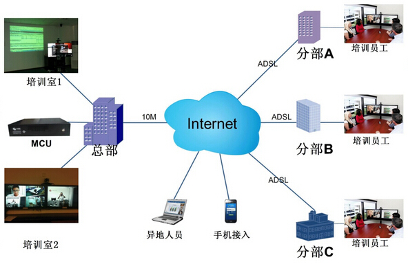 企業(yè)培訓(xùn)系統(tǒng)與跨區(qū)域會議系統(tǒng)可以通用,只需將會議室改為培訓(xùn)教室即可。例如培訓(xùn)師在總部培訓(xùn)教室進行授課,總部參訓(xùn)人員在現(xiàn)場參與培訓(xùn),分支機構(gòu)的參訓(xùn)人員則在當(dāng)?shù)氐呐嘤?xùn)室參訓(xùn),外地出差的人員則通過筆記本電腦接入或手機終端接入,所有參訓(xùn)人員一個不落地參與培訓(xùn)。•總部培訓(xùn)師對所有分支機構(gòu)人員進行交互式遠程培訓(xùn)•異地分支機構(gòu)(如異地研發(fā)中心)可對總部及其他分支機構(gòu)進行遠程培訓(xùn)•對長期合作的客戶/ 代理商進行技術(shù)支持遠程培訓(xùn)、銷售培訓(xùn)和指導(dǎo)